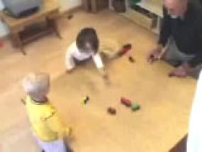 A boy (in yellow) and a girl (in white), each two years of age, are playing with small toy cars on a raised platform. George, a visiting adult, enters the game. During this episode, George looks for opportunities to increase the complexity of the children’s play. He is careful not to voice the details of his own actions, but instead describes only the effects, e.g. "That time they did not spin around." Highlighting these visible effects causes the children to invent their own strategies to recreate the effects themselves.