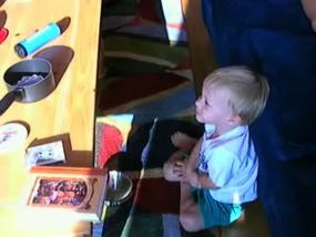 Owen accidentally falls while pretending to cook playing cards in a pot. The fall surprises him and hurts a little because as he falls he bumps his left forearm on the edge of the coffee table. Owen wants to better understand what has happened, so a few seconds later he re-enacts the fall deliberately, as if in so doing he can figure out how he hit his forearm. Study how Owen re-enacts the fall. Owen acts just like a golfer who re-enacts a missed putt in an attempt to figure out what went wrong. Here is a child of 27 months who can take a reflective attitude towards an accident so that he can learn something from his tumble!