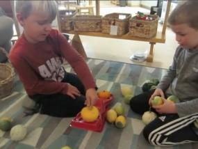 Two four-year-old boys are working with a balance and a collection of gourds. Tyler explains, “We're trying to get this to go this way, and this one's too heavy.”