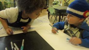 Harrison and Harper, both three-years-old, are working in the studio with markers. As this episode begins, Harrison is slowly saying the letter names aloud as he writes his name, and Harper watches intently. We see that Harrison has already identified some of the regularities of written language. He knows that each letter name has a corresponding letter form (symbol). His writing also includes a knowledge of basic text conventions. Harrison writes distinct letter shapes, spaced apart, along a horizontal line (letter string), moving from left to right (directionality).